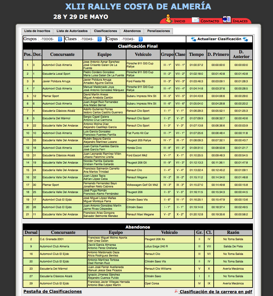 Clasificación Rallye Costa de Almería 2016. (fuente: tiempos on-line)