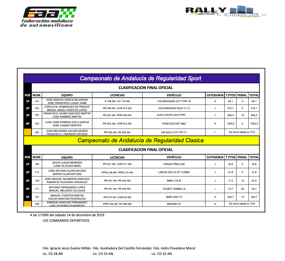 En Regularidad Clásica, la modalidad en la que el copiloto es mucho más que el 50% del equipo. Victoria y Título para el Honda Prelude de Jesús Luque y Luisa Villegas que a su vez es la campeona de copilotos. Bonita fue la lucha que mantuvo todo el rallye con el Lancia Delta de Jose Antonio y Sergio Alarcón (Padre e hijo).
